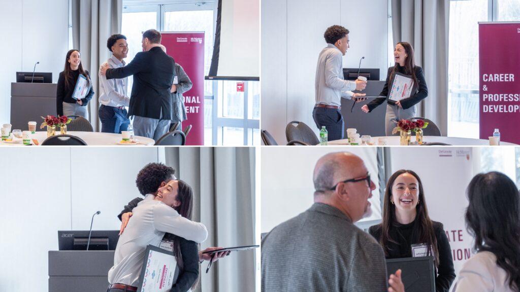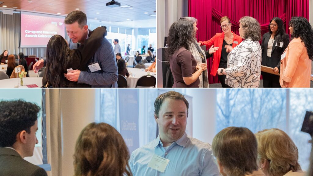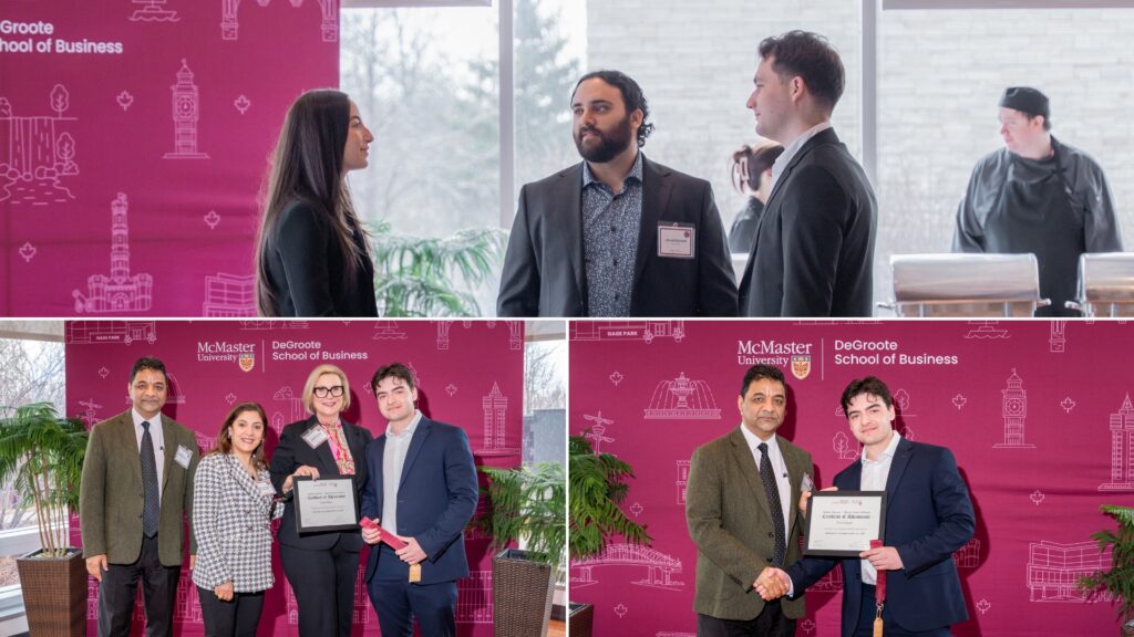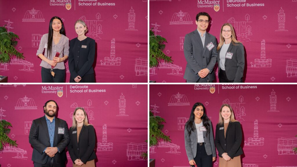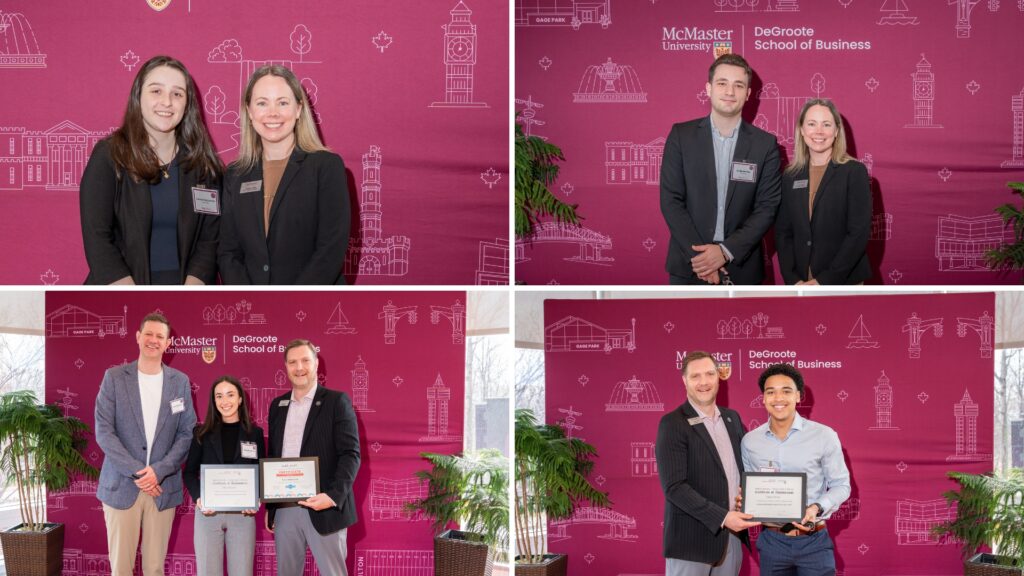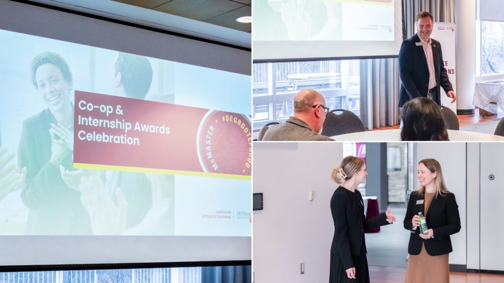 Employer partners and McMaster students networking at the Co-op and Internship Awards Celebration dinner.The Co-op and Internship Awards Celebration dinner recognized employer partners across faculties, including DeGroote, Engineering, Humanities and Science.From left to right (top to bottom): The DeGroote Co-op Supervisor of the Year 2025 went to Emily Cichonski, MA, CHE, CW OHT Manager, Integrated Health Systems, William Osler Health System, who was nominated by Hiyam Gedalia; the DeGroote Co-op Supervisor of the Year 2025 went to Luke Westfall, Managing Director and Practice Lead for Climate Services, Quinn+Partners, who was nominated by Aryan Munshi; the recipient of the DeGroote Co-op Supervisor of the Year 2025 was Elodie Li, Senior Manager MarTech Experience and Operations, Tangerine, who was nominated by Suzy Hamed; and the DeGroote Co-op Employer of the Year – Emerging 2025 recipient was Praxus Health, who was nominated by Arpita Sarker, MBA.From left to right (top to bottom): The DeGroote Co-op Employer of the Year 2025 went to TELUS Agriculture & Consumer Goods, which was nominated by Kudzaishe Chitima and Yishu Zhang; Sanofi, which was nominated by Prasha Sivasundaram and Sushmitha Pallapothu, won the DeGroote Co-op Employer of the Year award for 2025; Alex Albertson from Canadian Tire Bank, who was nominated Sofia Malatesta, won the Internship Supervisor of the Year award for 2025; Reid Stieler from TFI International, who was nominated by Zachary Shifman, also won the Internship Supervisor of the Year award for 2025.From left to right (top to bottom): The Internship Employer of the Year – Emerging 2025 went to Jan Kelley, which was nominated by Luke Pridgeon; Internship Supervisor of the Year for 2025 went to Colin Reynolds, Senior Sales Manager, Equipment Finance, TD Bank, who was nominated by Graydon Szego; Internship Employer of the Year for 2025 went to Fujifilm Canada, which was nominated by Jessica Su; Teranet also received the Internship Employer of the Year – Emerging 2025 award.Staff, faculty and DeGroote students networking at the Co-op and Internship Awards Celebration breakfast.The celebration breakfast recognized outstanding DeGroote Commerce and MBA students for exceptional performance during their co-op and internship experiences.Euan Hayes, a 2025 DeGroote Co-op Student of the Year recipient, networking with Sofia Malatesta, a 2025 DeGroote Internship Student of the Year recipient and honourable mention in the CEWIL Student of the Year Awards.From left to right (top to bottom): The student nominees for the DeGroote Co-op and Internship Student of the Year awards include Jessica Su, Fujifilm Canada; Eric Caravaggio, TFI International; Jacob Rashid, SC Johnson & Son; and Serena Sandhu, Bridge Medical Communications.From left to right (top to bottom): The DeGroote Co-op and Internship Student of the Year award nominees include Camryn McCarville, Ross Professional Corporation; Josip Marsic, Scotiabank; Sofia Malatesta, Canadian Tire Bank, who was one of the 2025 DeGroote Internship Student of the Year recipients and received an honourable mention in the CEWIL Student of the Year Awards; and Ayden Notice, CAUSEWORX, who was a finalist for DeGroote’s Student of the Year and McMaster nominee for EWO.