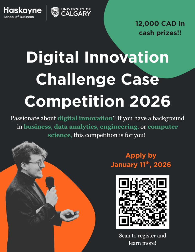 Students are invited to participate in the Digital Innovation Challenge Case Competition (DICC), hosted by the Haskayne School of Business at the University of Calgary. This annual event brings together students from diverse disciplines, including business, engineering, computer science, and data analytics – to tackle a real-world digital innovation case that challenges their creativity, analytical thinking, and teamwork.