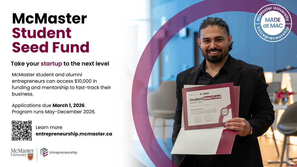 The McMaster Student Seed Fund (MSSF) supports students and alumni who have already validated their business idea and are ready to grow. Running from May to December, this program offers: