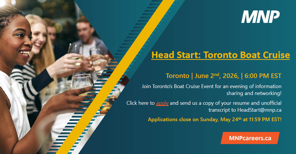 MNP is excited to bring back its Boat Cruise event! Students will have the opportunity to enjoy an evening of networking, information sharing, and connecting with industry professionals in a unique setting.