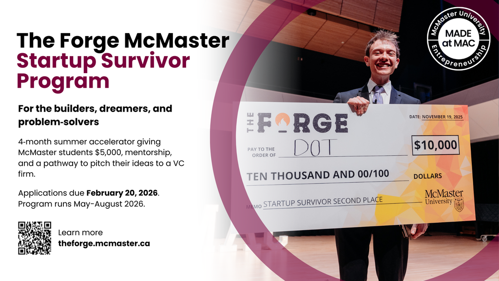 - $30,000 Pitch Competition during McMaster Entrepreneurship Week